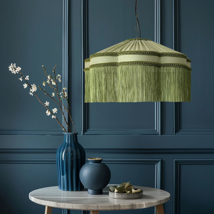 Scalloped Empire Fringed Lampshade in Linen–Silk Sage and olive | Handmade Pendant or Table Lamp Shade